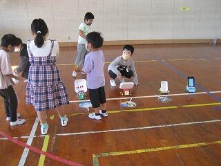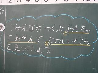 1年生の生活科の時間です。以前、自分たちで作ったおもちゃを使ってみんなで遊んでいます。自分が作ったおもちゃ、友達が作ったおもちゃ・・・。それぞれ楽しそうですね。