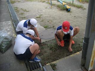 2学期が始まり、各学年で運動会(10月22日)に向けた練習が始まります。今日は児童がかけっこで使う直線トラックを中心に職員で草抜き等の整備を行いました。近くにいた児童クラブの友達も手伝ってくれました。元気に走る川東小の子どもたちの姿が目に浮かびます。