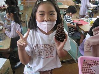 1年生はとってきたどんぐりやまつぼっくりでいろんな物を作る工作を行いました。穴を開けたり、集めて音が鳴るようにしたり、色をつけたり・・・。いろんな工夫をして楽しい物ができましたよ。
