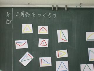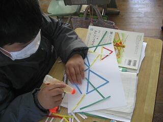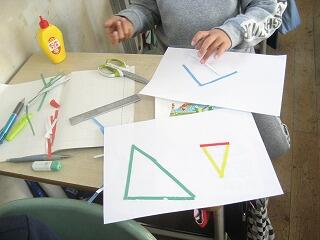冬休みも終わり、今日から各学年とも本格的に教科学習が始まりました。3年生は算数の時間にいろんな長さの線三本で三角形を作っていましたよ。線の長さを選ぶことによっていろんな形の三角形ができましたね。