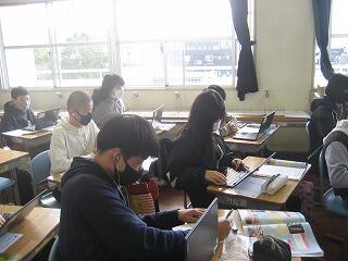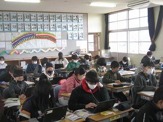 6年生の音楽の授業です。今日は「ハンガリー舞曲」の鑑賞です。動画で曲を鑑賞し、その感想や気づきをパソコン上で友達と情報交換しています。なかなか合唱や合奏が行えない中、ICTが活躍しています。