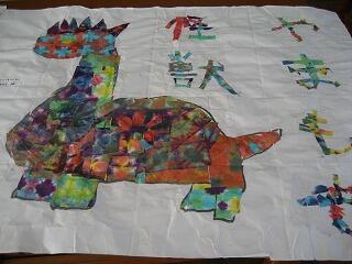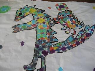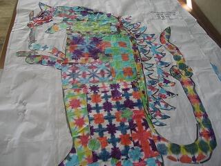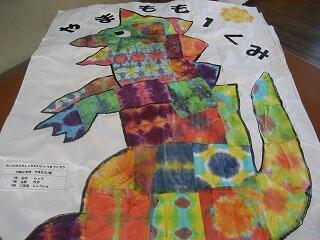 やまもも学級のみんなが作った作品です。以前「おり染め」で作ったきれいな模様の紙を使って怪獣やサメなどいろんな生き物を作り上げました。どの作品もいきいきとしてとても美しいですね。