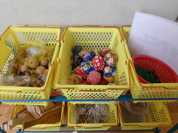 運動会の少し前に、図書室の掲示板に現れた赤白のかご。