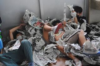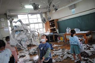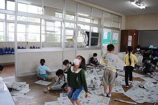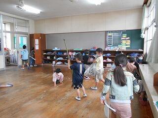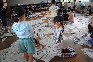 生活科室で、たくさんの新聞紙を広げて布団にしたり、ねじって綱引きをしてみたり、洋服やよろいや剣を作ったり、破って投げてみたりと2時間思いっきり新聞と遊びました。もちろん片付けもしっかりできました。