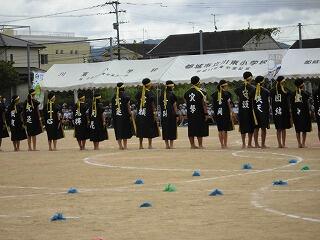 5・6年生は、オリンピック開会式にも使われた楽曲と共に入場し、ソーラン節を踊り切りました。法被の背中には、今まで一人一人準備して書いた文字がそれぞれ白く輝いていました。