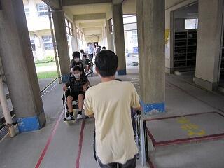車いすの体験では、少しの段差にも越えるのに苦戦していました。アイマスクをつけて廊下を歩く体験では、アイマスクをつける児童も 誘導する児童も どちらも歩くことに難しさを感じているようでした。