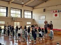 34名の元気な1年生が入学しました。新型コロナウイルスの影響で、例年とは違う形でしたが、素晴らしい式となりました。氏名点呼では、全員が元気に返事をすることができました。