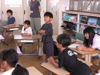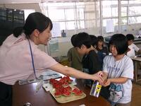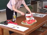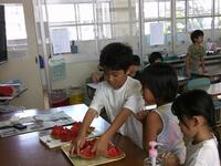 先生が切り分け、お待ちかねのスイカの試食タイムです。担任の先生が「どういう順番で取りに来る?」と子どもたちに判断を委ねました。いろいろな意見が出る中、ある児童が「さっき、私たちが譲ってもらったから、次の向こうの人たちから取ったらいいと思います。」と発言すると、みんなから「そうだね!」の声が。みんなで仲良くスイカをいただきました。