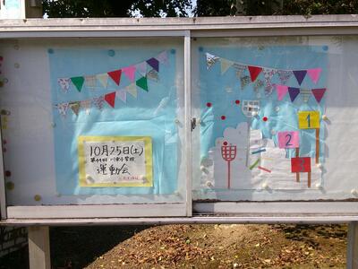 校内にも運動会に向けた掲示物が増えてきました。校門前の掲示板には、掲示担当の先生が作った作品が飾られています。色画用紙を使っており、運動会の様子が分かる素敵な作品です。