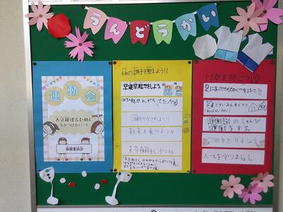 校舎の中には、養護教諭の先生と保健委員会の子どもたちで作った作品が飾られています。「運動会で大活躍するために気を付けること」として、保健委員会の子どもたちのメッセージがつけてあります。「早寝早起きをしよう」「栄養とすいみんをとろう」「ルールを守りましょう」どれも大事なメッセージですね。