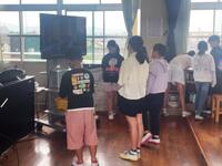 5年生がそれぞれのグループの中で高音・低音のパートに分かれ、合唱の練習をしていました。
