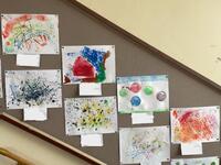 教室をめぐっていると、廊下や階段の掲示板に各学年の図画の作品を見ることができます。