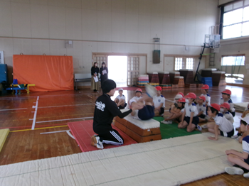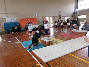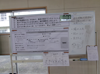 恐怖心や迷いを取り除くための場(まずはマットから→跳び箱二つ並べて→低い跳び箱→4段に挑戦!)の工夫がなされていました。