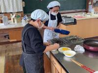 調理実習でいり卵を作っています。思ったよりもフライパンの使い方がうまいような…
