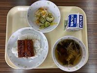 今日の給食は、宮崎県産のうなぎの蒲焼きでした。ご飯の上にのせて、おいしくいただきました。