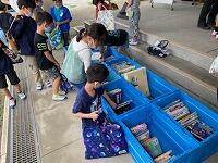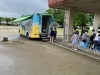 市立図書館の移動図書館「くれよん号」来校の日です。子供達はくれよん号の本棚やコンテナの中にある本を楽しそうに選んでいます。これからも、いろいろな本との出会いを愉しんでください