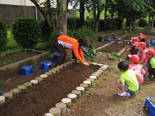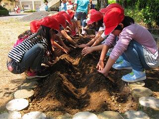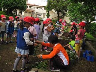 子ども達は芋の苗を見ると、『なんだかほうれん草みたい』、『根っこがある』と