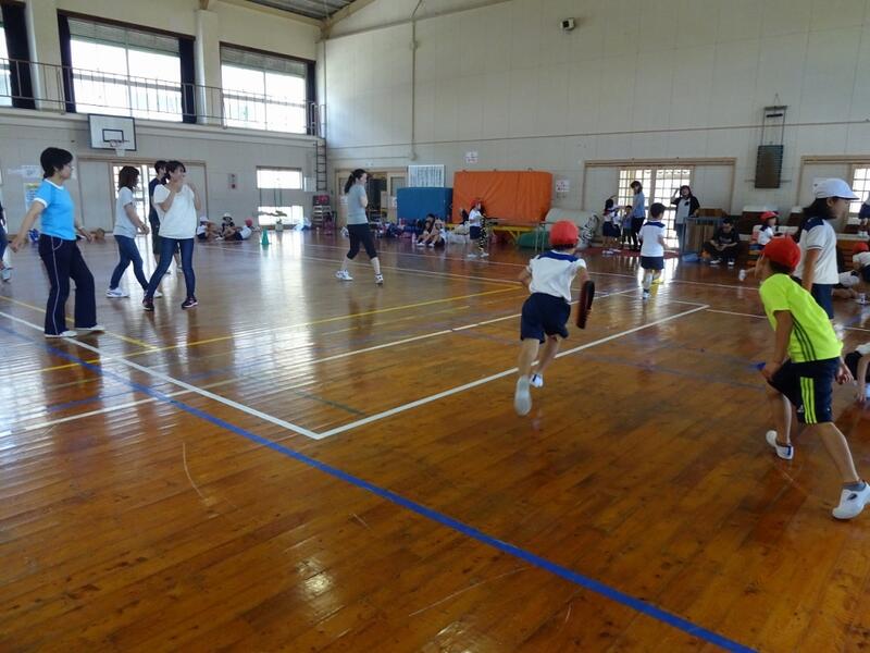 子どもたちは、お父さん・お母さん達に勝ちたいとディスクを投げ、