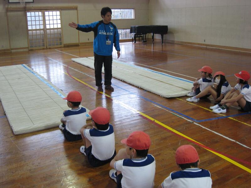 【体育座りでしっかり聞いています。】 【着地をびしっと決めるぞ~。】