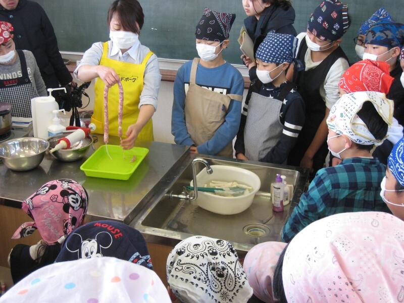 JA宮崎経済連からお二人の講師をお招きし、宮崎ブランドポークについての講義・実技指導をしていただきました。宮崎ブランドポークの説明のあと、ソーセージ作りも実施しました。