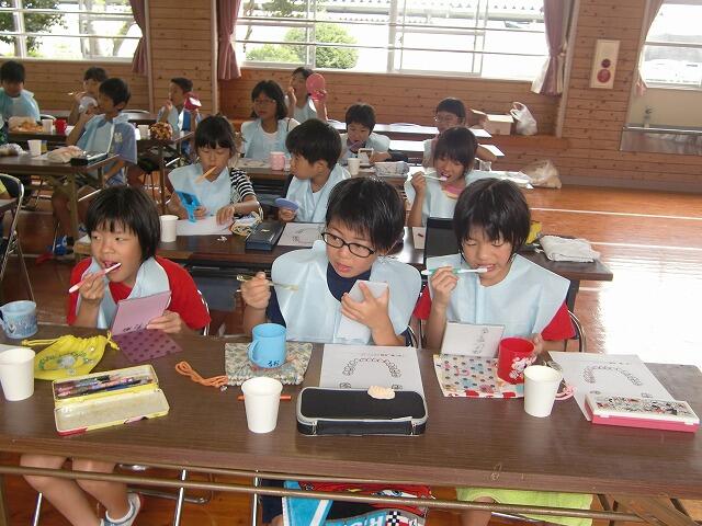 6月27日に3・4年生を対象に歯科保健指導がありました。学校の歯科医さんに来てもらい、虫歯の予防についての話を聞いたり、正しい磨き方を練習したりしました。専門の先生に磨き方を教えてもらい、歯垢を落とす磨き方が分かったようです。