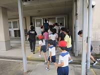 あいにくの雨模様のため、避難場所は体育館になりました。子どもたちは、避難のきまり「おさない・かけない・しゃべらない・もどらない・ちかよらない」をよく守って、体育館に落ち着いて移動することができました