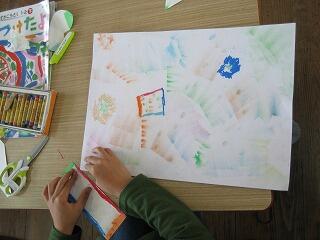 2年生は図工の時間に「ぼかしあそび」を行いました。クレヨンで色をつけたところを指でぼかしたり、別の紙を使って色をさえぎって面白い形にしたり。それぞれに工夫してすてきな作品を作り上げました。