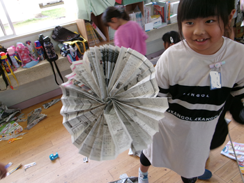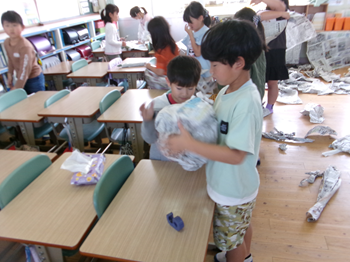 新聞紙をちぎったり丸めたり体にまいたり、基地をつくったり・・