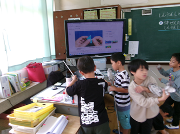 6年生は家庭科。学校の汚れを写真にとっています。撮影の後その場で汚れの種類ごと分類して保存し共有していました。