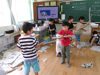 図画工作の時間に、新聞紙を使って自由に楽しむ活動を行っていました。