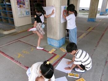 身の回りの様々な場所や物からでこぼこを探し出し、クレヨンや色鉛筆でこすって