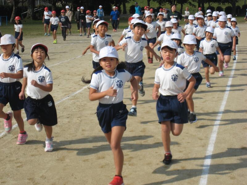 内側のコースが1・2年生、中のコースが3・4年生、外のコースが5・6年生、外周のコースは見学者というようにコース分けをして行います。(見学者は体調に合わせての歩行)