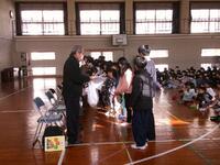児童代表から、感謝状や鉢植えの花を手渡した後、児童全員で歌のプレゼントをしました。