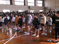 2年生の体育の授業では、なわとびをやっていました。3人がタイミングを合わせて1つの縄を使って飛ぶ練習をしています。タイミングを取るのは難しそうですが、寒い中、一生懸命頑張っていました。