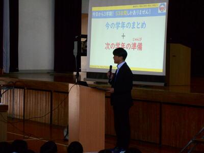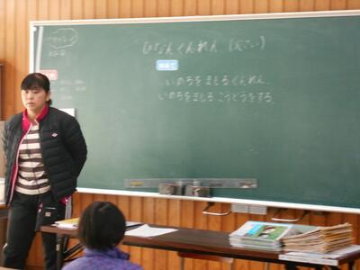 2年生のクラスです。避難訓練の目的や避難時の留意点などを、担任が分かりやすく説明します。
