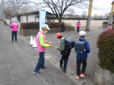 今日は、横市地区の民生委員、児童委員の皆さんが、今年度最後のあいさつ運動に参加してくださいました。