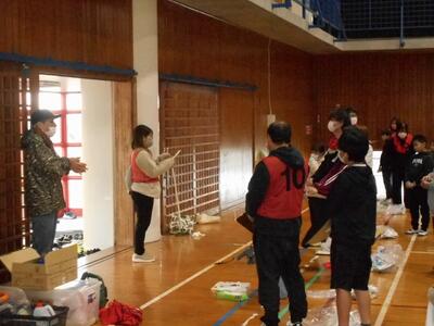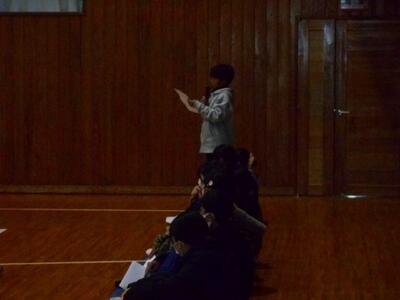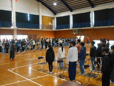 体育館に集合して、PTA役員の方からの説明を聞きます。各支部ごとに場所を分担しています。