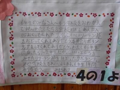 6年生のこれまでの努力は、下級生に引き継がれています。卒業まであとわずかですが、6年生には小学校の楽しい思い出をたくさん作ってほしいと思います。