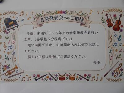 3年生から5年生の各クラスが合奏や合唱を発表してくれるようです。