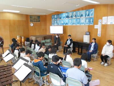 この日は、3年3組が合奏を発表してくれました。担任の先生や特別支援学級の先生、支援員の先生も招待されています。
