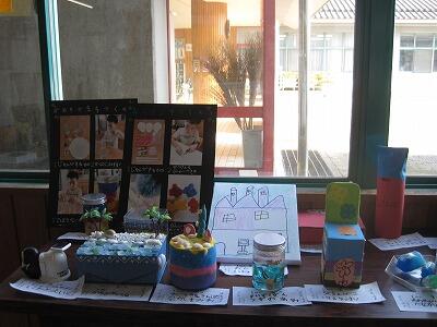 7月16日(金)、2階のフロアーの1角に素敵な展示コーナーができていました。4年生が図工の学習で作った作品が展示してあります。天井から吊り下げたネットや切り株に、たくさんの作品が飾られています。みんなワクワクしながら興味深そうに見入っています。