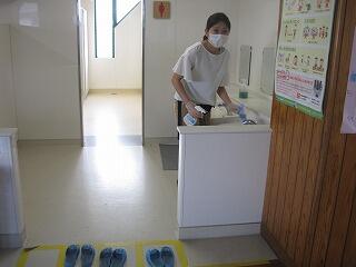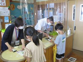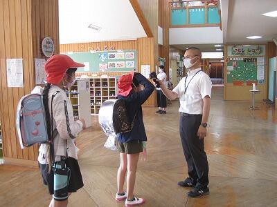 8月27日(金)、学校では新型コロナウイルスから子供たちを守るために、これまで以上に様々な対策を取っています。登校時は、児童玄関で検温と消毒をしてから教室に入ります。みんな一列に並んで静かに検温を待っています。授業中は常時換気、水道は一つおきに使用、手洗いと消毒、黙食の徹底など。8月は、昼休みなしで給食後下校となります。しばらくは我慢が続きますが、元気が一番。ご家庭でも、登校前の健康チェック、マスク着用などのご協力をお願いいたします。