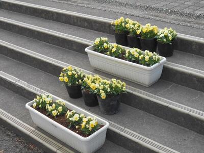 ただ、最後の6年生の登校を少しでもはなやかにしたく思い、ささやかですが、北通用門入口の階段にビオラの花を並べました。このビオラは、「フロリスト花もよう」さんからいただいた苗を育てた花です。