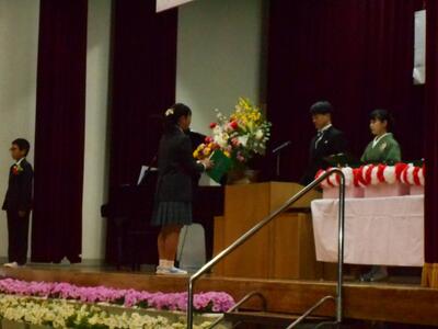 子どもたちへの記念品の贈呈です。6年生2名には、名前の入ったボールペンを、5年生にはカラーペンのプレゼントがありました。子どもたちも大喜びです。