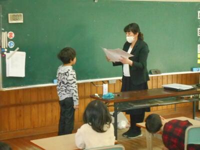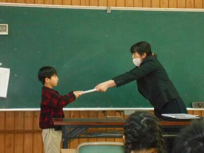 教室では担任の先生から「あゆみ」が渡されました。この一年間でできるようになったことや期待することなど、担任の先生からの「メッセージ」が書かれています。子どもたちは緊張した面持ちで担任の先生から受け取っていました。