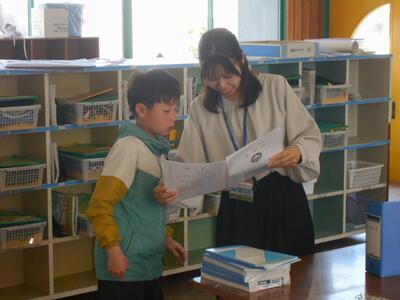図書館サポーターの中武先生と図書担当の有薗先生が、子どもたちが、より読書に親しめるために、図書室の環境整備に常に取り組んでいただいています。