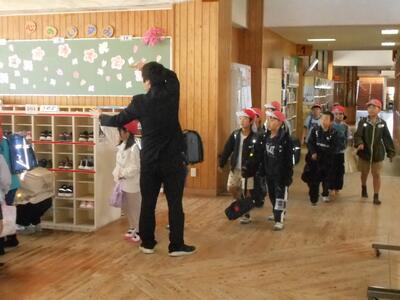 下校の時間です。2年生は担任の先生とハイタッチをして帰っていきました。