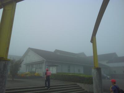 今朝の濃霧に包まれた明和小です。子どもたちは、いつもより少し早く登校してきました。