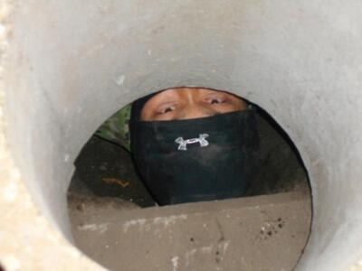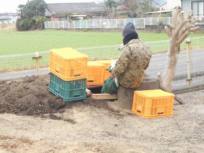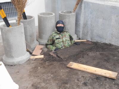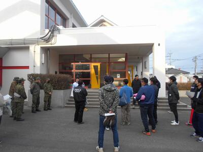 この日はとても寒かったのですが、親父っどんの会の皆さん、PTA役員の皆さん、自衛隊の皆さんが早朝から集まって、入念な打ち合わせを行っていました。私も皆さんと一緒に隠れる場所の確認をしましたが、「こんなところに隠れるの??」というところばかりでした。