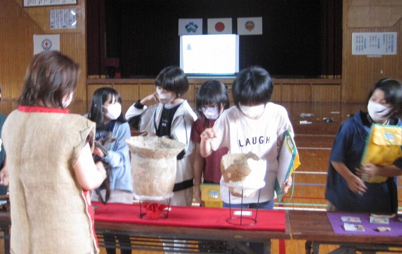 先週、市の文化財課から4名が来校されて、縄文時代や弥生時代の生活などについて教えてくださいました。市内で発掘された2千年前の土器のかけらや、狩猟で使っていたおのや矢じりなど実際に見たり触れたりしながら学習しました。本校から出てきた土器のかけらもあり、子どもたちはとても興味深く触ったり質問したりしていました。